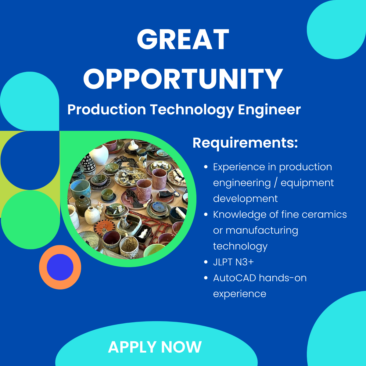 We are looking for talented engineers for Production Technology roles in the Fine Ceramics (ファインセラミックス) industry.