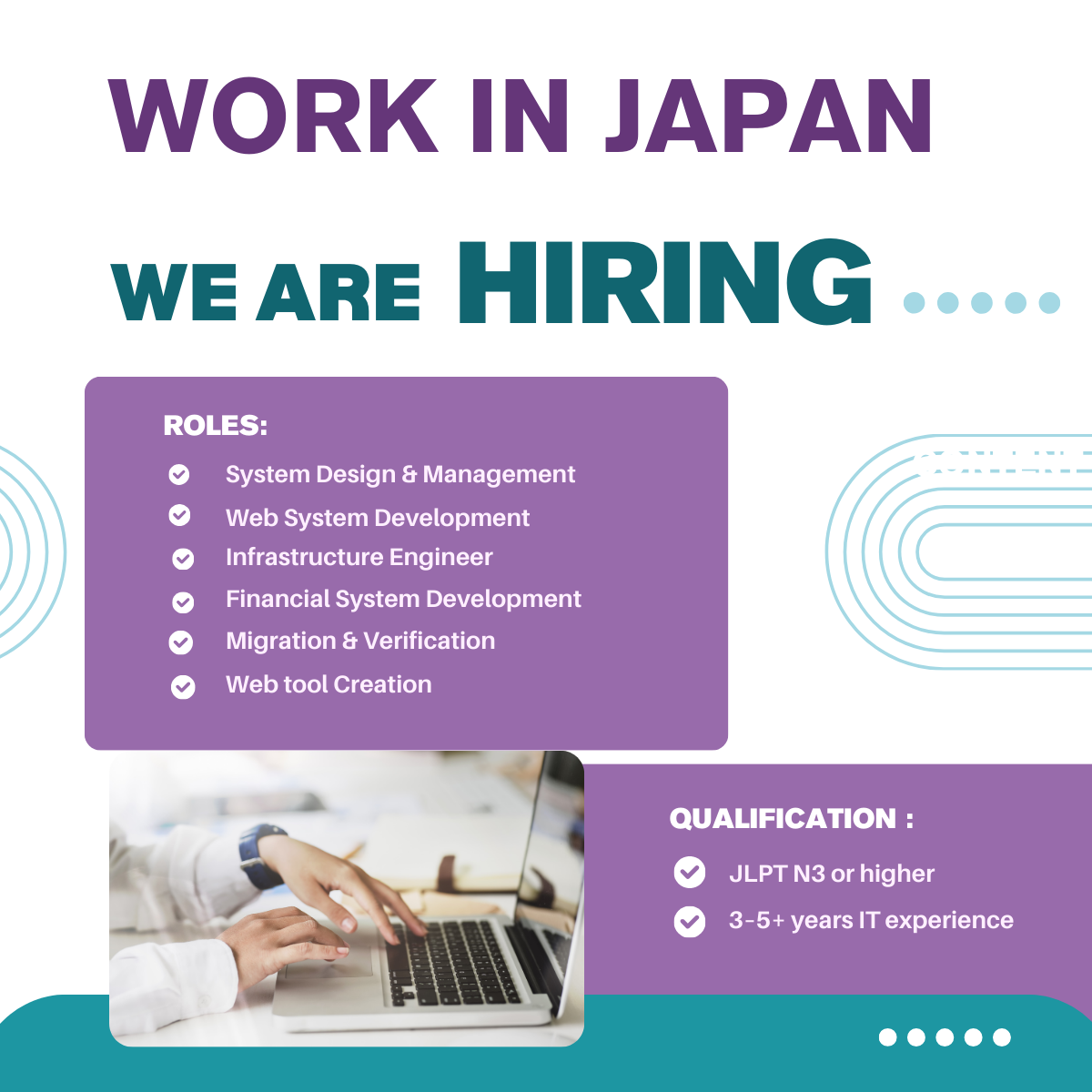 We are actively seeking experienced, motivated IT professionals! This is a fantastic opportunity for candidates based in India 🇮🇳 and Japan 🇯🇵 who hold JLPT N3 or higher certification. Join us for stable, long-term projects in Japan's advanced tech sector.